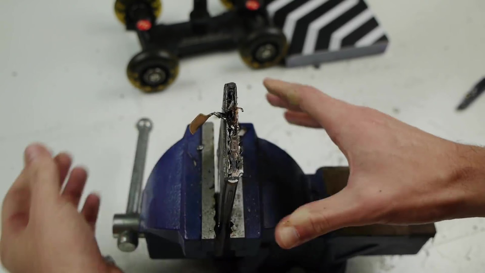 Nạn nhân của màn tra tấn này là iPhone X Space Gray còn mới tinh. Chủ nhân của nó đã dùng máy cắt cầm tay để loại bỏ “tai thỏ” chướng mắt. Khi lưỡi cưa xén vào một đoạn thì màn hình dần mờ đi sau đó nhấp nháy ánh sáng xanh một lúc. Cho đến khi lưỡi cưa xén ngọt thì iPhone X mới hỏng hoàn toàn.