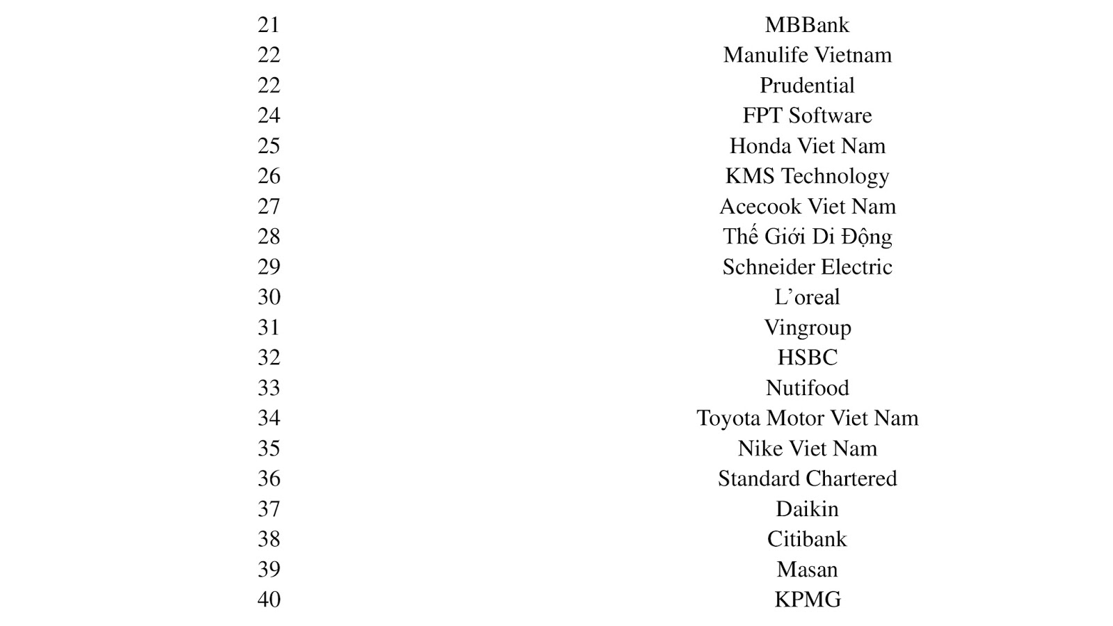 Những tên tuổi mới gồm có FWD Việt Nam, Nhựa Duy Tân, DKSH, Chubb Life, Greenfeed, L’oreal… Có nhiều công ty Top 10 năm ngoái không nằm trong vị trí dẫn đầu nữa như IBM Việt Nam từ vị trí số 5 xuống 14; Microsoft từ vị trí số 4 xuống 17…