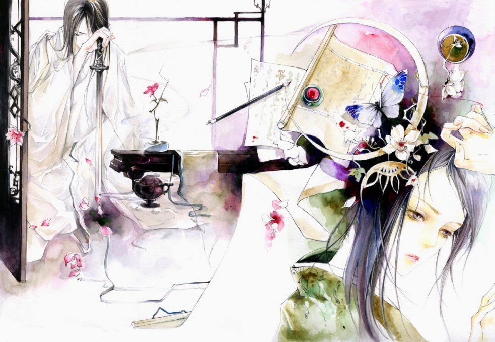 “Phản chiếu trên mặt hồ, thiếu nữ ấy có một đôi mắt trong suốt màu tím giống như nước hồ mùa thu nhưng lại lạnh lùng giống như sương, một chiếc mũi khéo léo, đôi môi đỏ mọng, da trắng nõn nà, khuôn mặt thanh lệ tuyệt sắc, chỉ là da thịt thiếu một tầng huyết sắc, tỏ ra dị thường yếu ớt.
