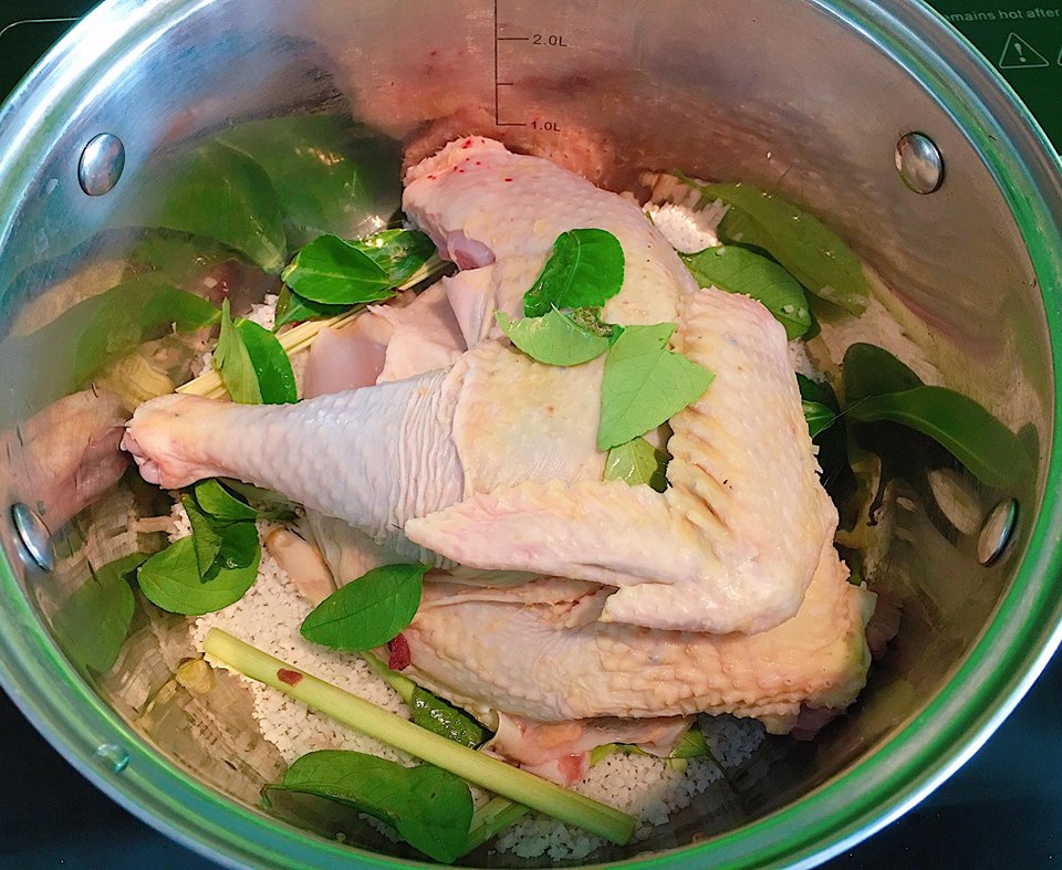 + Cho gà vào nồi, bụng gà nằm trên muối.