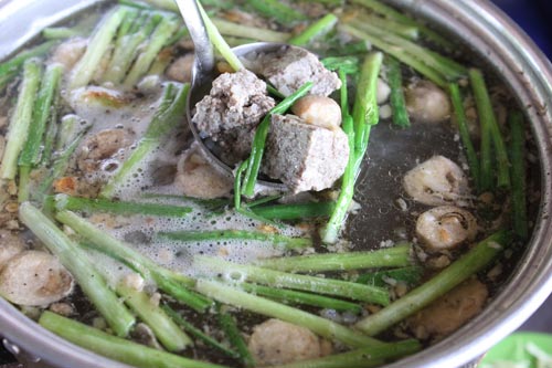 Đặc biệt, món bánh canh bột xắt thịt vịt không thể thiếu miếng huyết vịt đông nếp dẻo và chén nước chấm mắm gần. Hai món phụ trợ này giúp tăng thêm độ ngon đặc trưng cho đặc sản Bến Tre.