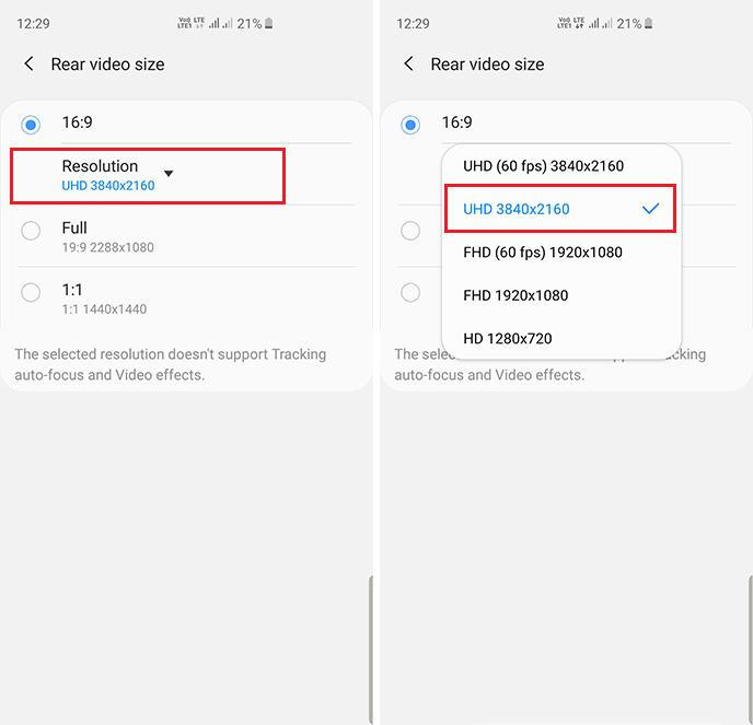 Bước 1. Mở Cài đặt camera và Nhấn ‘Rear Video size’ để chọn độ phân giải.