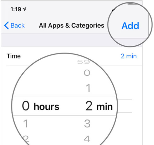 Ví dụ: nếu bạn đặt một phút, ứng dụng sẽ bị khóa sau khi được sử dụng trong một phút. Để khóa ứng dụng, hãy đặt một phút và sau đó nhấn vào Add ở góc trên bên phải màn hình.