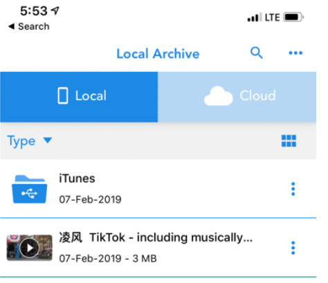 Bước 7: Nhấn vào biểu tượng File và từ phần Local, bạn sẽ thấy video đã tải xuống ngay tại đó. Từ đây, nhấn vào nút Menu bên cạnh video để biết các tùy chọn. Bạn có thể chuyển đổi video thành âm thanh hoặc tải lên tài khoản đám mây. Nếu bạn muốn lưu nó vào Camera Roll, hãy nhấn vào Chia sẻ và sau đó chọn Lưu video.