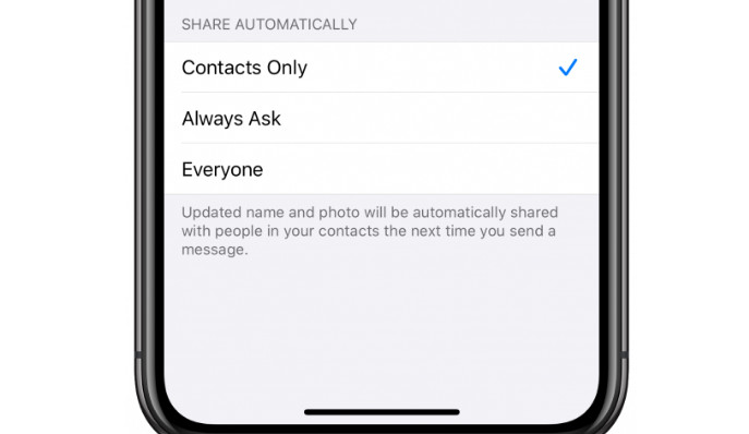 – Luôn hỏi: Bạn sẽ được nhắc trước khi ảnh hồ sơ và tên hiển thị iMessage của bạn được chia sẻ với bất kỳ ai bạn nhắn tin qua giao thức iMessage (bong bóng màu xanh).