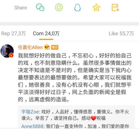 Sau đó, Nhậm Gia Huân còn bình luận ở bên dưới: “Tôi chỉ muốn làm tốt chính mình, quay thật tốt phim của mình, không quên thuở ban đầu, cũng không muốn che dấu điều gì, nhưng mà rất nhiều sự việc khi đưa ra quyết định không biết đúng hay là sai, nhưng mà đó quả thực là điều mà khi đó tôi muốn làm nhất, muốn biểu đạt nhất. Hy vọng mọi người có thể chúc phúc cho chúng tôi, cô ấy rất lương thiện, chẳng có tâm cơ, lòng dạ gì cả. Chúng tôi chỉ muốn sống qua những ngày tháng bình đạm. Những lời đồn trên mạng đều là giả, xin hãy tránh xa những lời đồn ác ý”.