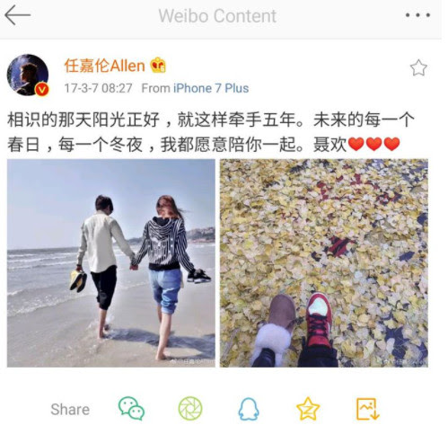 Vào buổi sáng ngày 7.3.2017, Nhậm Gia Luân có một post trên weibo với một tấm ảnh sau lưng của anh nắm tay một cô gái còn một tấm là chân của hai người cùng nội dung: “Quen biết nhau vào một ngày nắng thật đẹp, cứ như vậy mà nắm tay nhau đã 5 năm rồi. Tương lai, mỗi một ngày xuân, mỗi một đêm đông, anh đều bằng lòng ở bên em. Nhiếp Hoan”.
